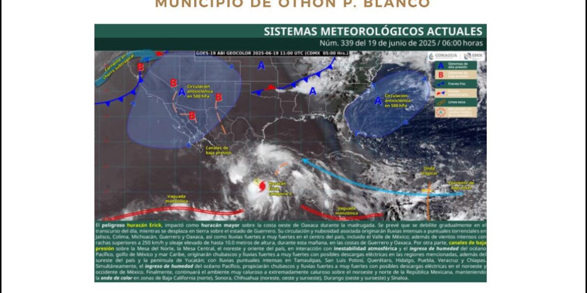 Quintana Roo: cielo parcialmente nublado a nublado, con probabilidad de tormentas puntuales fuertes en el sur del estado, así como intervalos de chubascos con tormenta en el centro y norte de la entidad. Ambiente caluroso a muy caluroso durante el día y cálido en la noche. Vientos del este-sureste de 20 a 40 km/h, con rachas mayores a 50 km/h.